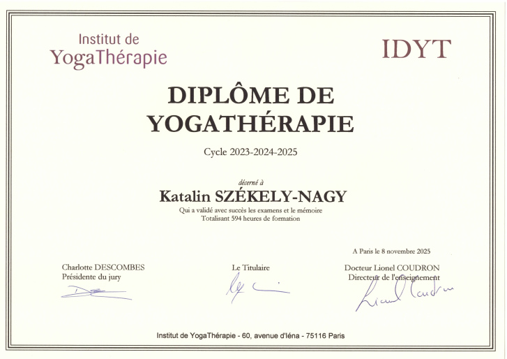 C’est dans cette optique que j'ai suivi une formation de deux ans à l’Institut de YogaThérapie du Dr Lionel Coudron pour devenir yogathérapeute certifiée.