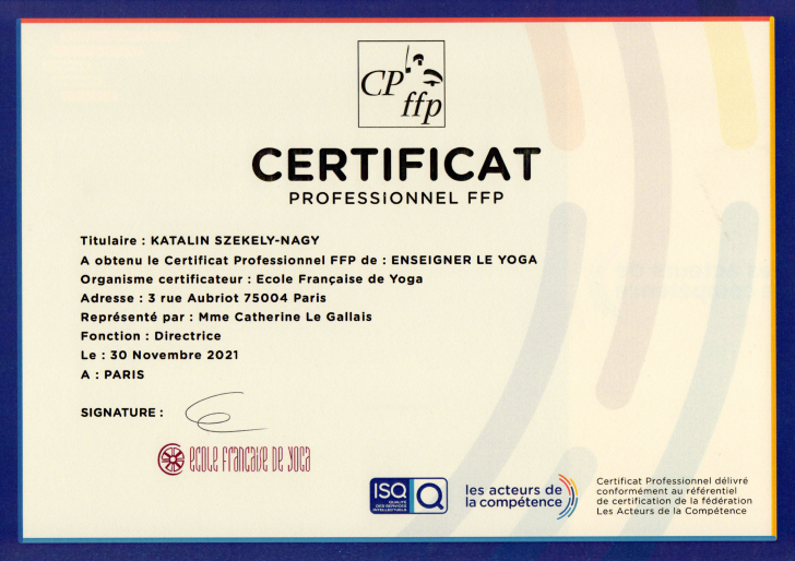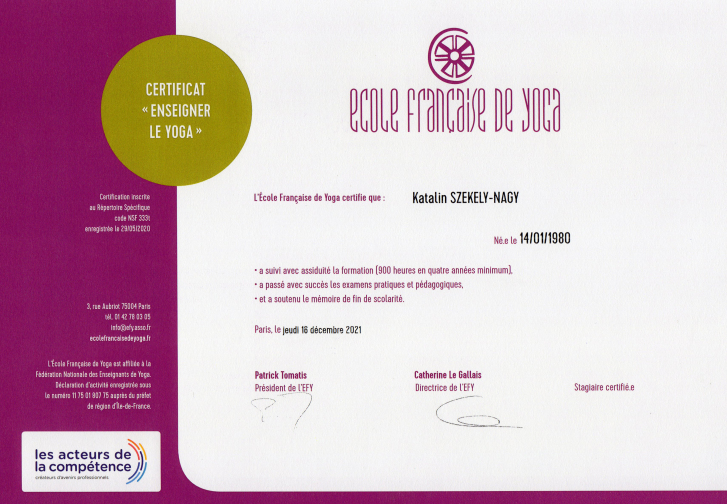 Pratiquant le yoga de manière assidue depuis plus de 20 ans, cette discipline est devenue aujourd'hui le socle de ma vie quotidienne. Ayant débuté ma vie professionnelle dans le milieu des médias et du marketing, j'ai ressenti de plus en plus fortement une « invitation » — voire un réel besoin — à me tourner vers l’enseignement du yoga. Cette réflexion m’a conduite, en 2017, à m’inscrire à l’École Française de Yoga de Paris, où j’ai suivi une formation approfondie sur quatre années (900 heures). Après la soutenance de mon mémoire, j'ai obtenu un diplôme d'état de professeure de yoga. Désireuse de transmettre le yoga non seulement aux adultes mais aussi aux enfants, j’ai également suivi une formation à l’École de Yoga Natha, qui m’a permis d’obtenir un diplôme de professeure de yoga pour enfants.